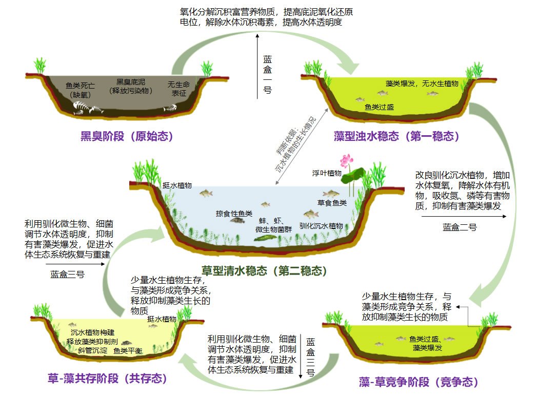 黑臭階段(原始態),氧化分解沉積富營養物質,提高底泥氧化還原電位,解除水體沉積毒素,提高水體透明度;藻型濁水穩態(第一穩態),改良馴化沉水植物,增加水體復氧,降解水體有機物,吸收氮、磷等有害物質,抑制有害藻類爆發;藻-草競爭階段(競爭態),少量水生植物生存,與藻類形成競爭關系,釋放抑制藻類生長的物質,利用馴化微生物、細菌調節水體透明度,抑制有害藻類爆發,促進水體生態系統恢復與重建;草-藻共存階段(共存態),少量水生植物生存,與藻類形成競爭關系,釋放抑制藻類生長的物質,利用馴化微生物、細菌調節水體透明度,抑制有害藻類爆發,促進水體生態系統恢復與重建;最終形成草型清水穩態(第二穩態)。適用于湖泊、水庫、景觀水體等。