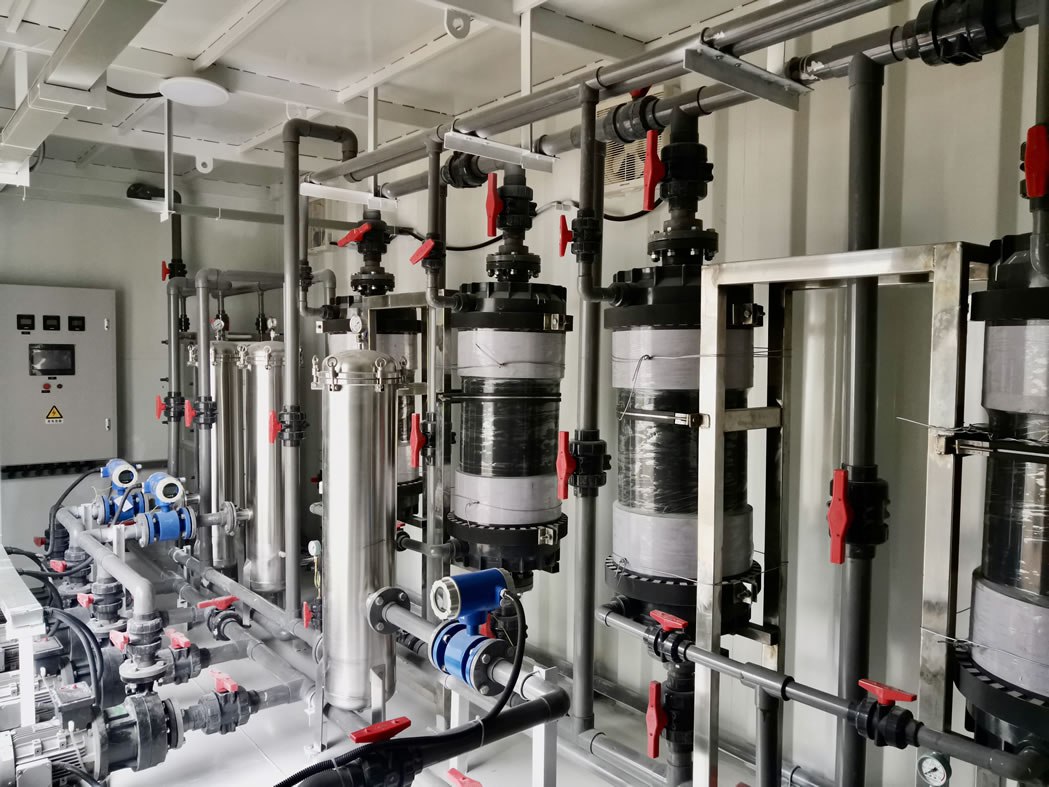 DD-OD主要分為道南滲析(DD)和滲透蒸餾(OD)兩個部分。道南滲析以驅動離子(Na+)和目標離子(NH4+)的濃度差為驅動力,使銨離子通過陽離子交換膜進入高pH的接收室,同時將氨素轉化為NH4+形式;在滲透蒸餾部分,高堿度使接收室中的NH3快速逃逸,通過疏水透氣膜進入酸室并恢復至NH4+形態,最終以高純度銨鹽的形式獲得產物,用于下游使用。工藝包括原水單元、堿液驅動單元、酸液回收單元、膜清洗單元、自動化控制及儀表電氣單元。氨氮去除率達80%,回收率達90%。通過高中濃度堿驅動高效離子分離耦合氣態回收過程,無需外加能源,節能降耗,實現近“零能耗”氨氮資源回收;通過離子交換膜-透氣疏水膜雙膜耦合抗污,解決透氣疏水膜易污染、易堵塞難題,減少膜更換頻率、降低成本;過程無副反應,無二次污染,且回收的硫酸銨溶液可作為優質氮肥原材料,實現資源化閉環。適用于各類氨氮廢水。