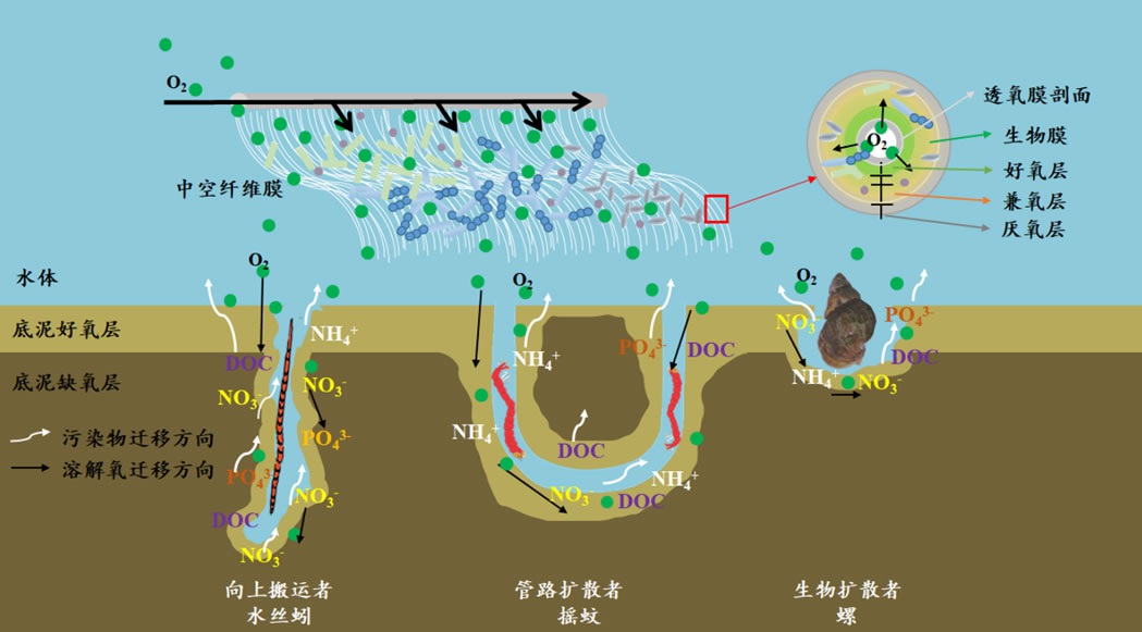 工藝利用優(yōu)勢底棲動物蘇氏尾鰓蚓耦合微納米孔氣體分離膜與無泡透氧生物膜,通過優(yōu)勢底棲動物對黑臭淤積底泥進行擾動,形成污染物在上覆水和底泥中的遷移轉(zhuǎn)化,引起沉積物微環(huán)境和微生物豐度、多樣性及群落結(jié)構(gòu)的變化;利用孔徑為0.1-1μm的均質(zhì)膜,該膜氧傳質(zhì)效率是普通曝氣的3倍以上,能耗降低40%,通過膜表面微孔結(jié)構(gòu)實現(xiàn)微納米曝氣,為上覆水提供穩(wěn)定的氧氣供應(yīng),改善溶解氧;無泡透氣生物膜比表面積達500m2/m3,微生物負載量提升3倍以上,形成內(nèi)層好氧、外層缺氧的雙功能區(qū),好氧層完成氨氮的硝化,缺氧層利用碳源進行反硝化,同時生物膜內(nèi)的聚磷菌通過厭氧釋磷和好氧吸磷實現(xiàn)除磷。建立內(nèi)源污染的“底棲擾動釋放-界面微環(huán)境重構(gòu)-微生物群落結(jié)構(gòu)改變-內(nèi)源污染的削減與水質(zhì)提升”關(guān)系模式,完成內(nèi)源污染原位強化削減。適用于河道、內(nèi)河底泥黑臭治理;湖泊、水庫內(nèi)源污染治理。