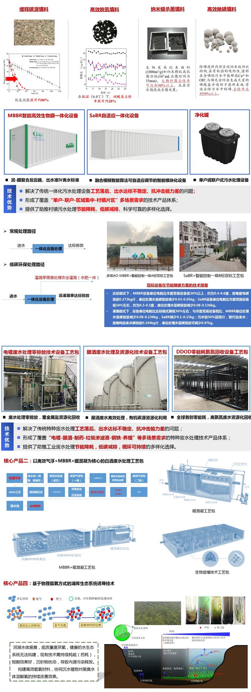 10+核心產(chǎn)品即“以新型填料(碳源緩釋、高效除磷等)為核心的村鎮(zhèn)無動力低碳生態(tài)處理技術工藝包”、“以改良A2/O工藝、MABR技術為主的微動力凈化槽/SaBR+生物倍增技術/多級AO+生物倍增為主的主流工藝包”、“以SaBR、多級AO+智能控制為主的低碳節(jié)能雙標準(灌溉/環(huán)保達標)工藝包系列”、“以裝配式污水處理為主的低碳節(jié)能應急污水處理廠工藝包”、“以DD-OD(滲透-蒸餾)為核心的高氨氮廢水(垃圾滲濾液全量化處理、沼液等)工藝包”、“以高效氣浮+MBBR+磁混凝為核心的白酒廢水處理工藝包”、“以改性納濾、反滲透膜+MVR蒸發(fā)為核心的電鍍廢水“零排放”工藝包”、“Five states ecological restoration技術工藝包(簡稱FSER技術)”等。
