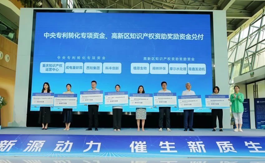 西部科學城重慶高新區(qū)黨工委副書記、管委會主任聶紅焰向我司等企業(yè)頒發(fā)中央專利轉化專項資金、高新區(qū)知識產權資助獎勵資金兌付支票