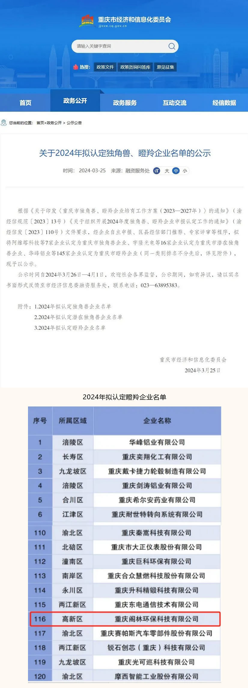 近日,重慶市經(jīng)濟(jì)信息委發(fā)布2024年度市級(jí)獨(dú)角獸及瞪羚企業(yè)評(píng)選認(rèn)定公示名單,重慶閣林環(huán)保科技有限公司(以下簡(jiǎn)稱“閣林環(huán)保”)榮獲2024年度重慶市“瞪羚企業(yè)”稱號(hào)。